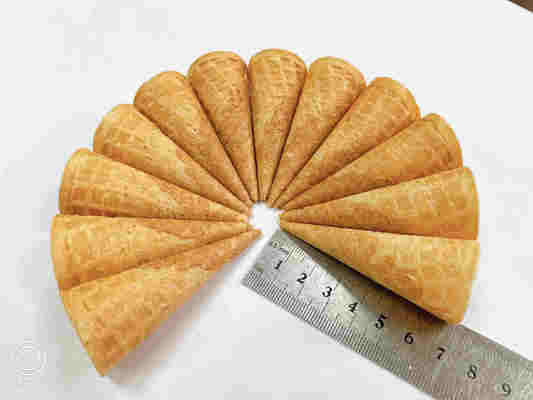 ③ De gebakken wafelvellen worden automatisch overgebracht naar het rolsysteem, waar ze in kegelvormen worden gerold.